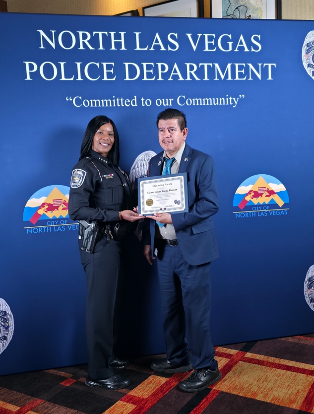 NLVPD Chief Gravatt praised Councilman Barron’s actions: “Councilman Barron’s bravery and quick thinking reflect the very best of our community. His actions stopped a violent attack and preserved a life. It is a privilege to recognize him with the Lifesaving Award.”