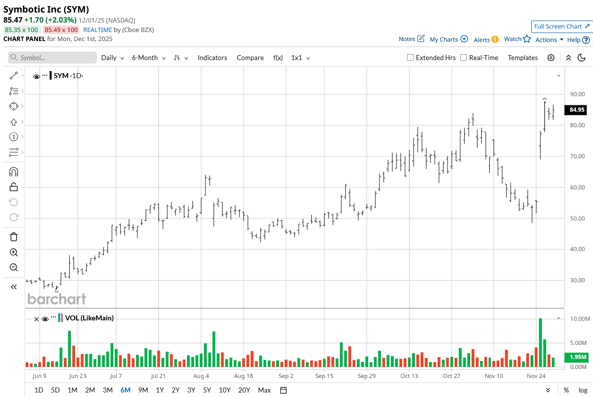 Symbotic (SYM) is an automation technology leader that designs and deploys AI-powered robotic systems to modernize warehouse and supply chain operations. Its end-to-end platform uses intelligent software and high-speed autonomous robots to store, retrieve, and sequence goods with high efficiency, helping large retail, wholesale, and food & beverage companies improve speed, accuracy, and space utilization in distribution centers.