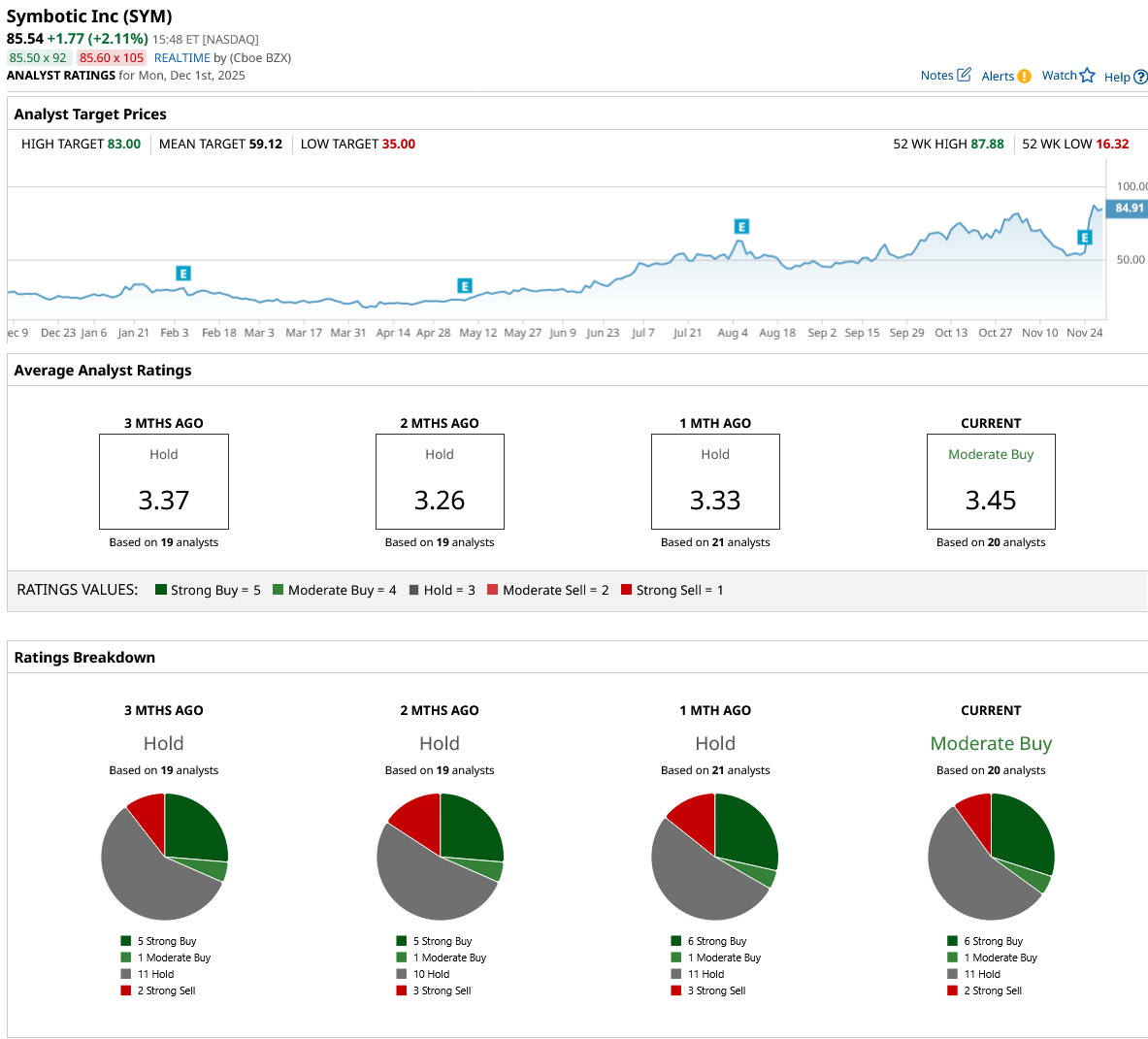 SYM stock has seen unprecedented gains this year, which also translates to an upgrade from a consensus “Hold” rating to a “Moderate Buy” rating among analysts. However, despite the upgrade, the stock still trades a few steps above its mean price target of $59.12, reflecting a downside potential of 31% from the market rate, signaling that Wall Street is yet to catch up to its growth.