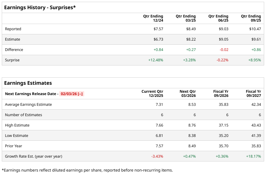 Turning to earnings visibility, TransDigm Group is set to report fiscal 2026 first-quarter results on Tuesday, Feb. 3, before markets open. Analysts expect diluted EPS of $7.31, down 3.4% from $7.57 in last year’s quarter. Still, the company has exceeded EPS estimates in three of the past four quarters, while missing in just one.