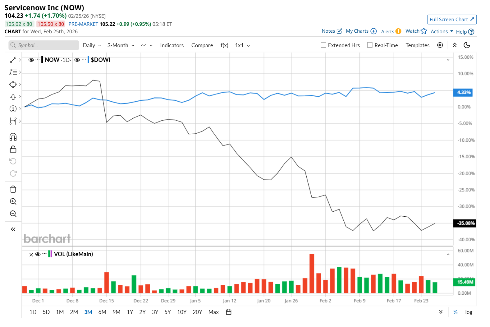 This software giant has dipped 50.7% from its 52-week high of $211.48, reached on Jul. 3, 2025. Shares of NOW have declined 36.9% over the past three months, notably lagging behind the Dow Jones Industrial Average’s ($DOWI5% rise during the same time frame.