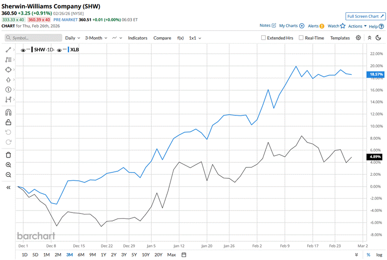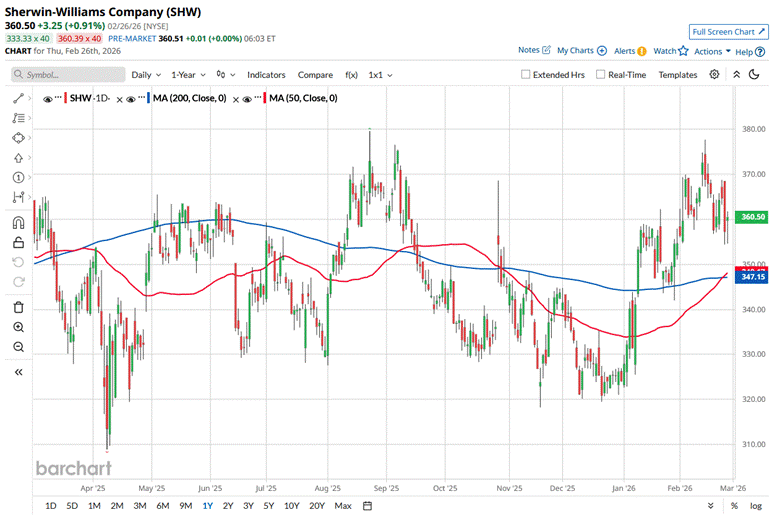 The stock touched its 52-week high of $379.65 on Aug. 22, 2025, and is currently trading 5% below that peak. SHW stock has grown 5% over the past three months, underperforming the State Street Materials Select Sector SPDR ETF’s (XLB) 19.3% surge during the same time frame.