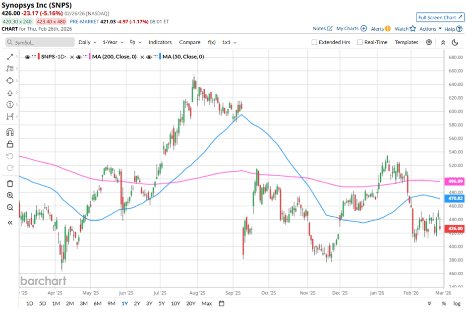 Shares of Synopsys fell 5.2% following its Q1 2026 results on Feb. 25, as investors reacted to full-year revenue guidance that came in slightly below expectations despite strong quarterly performance. Although Q1 revenue surged 65% year-over-year to $2.41 billion and adjusted EPS beat estimates at $3.77, the fiscal 2027 revenue guidance midpoint of $9.61 billion missed the consensus.