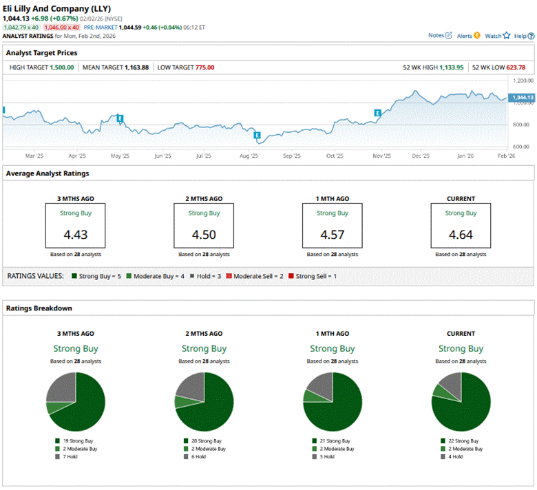 LLY’s mean price target of $1163.88 indicates a 11.5% premium to the current market prices. Its Street-high target of $1500 suggests a robust 43.7% upside potential from current price levels.