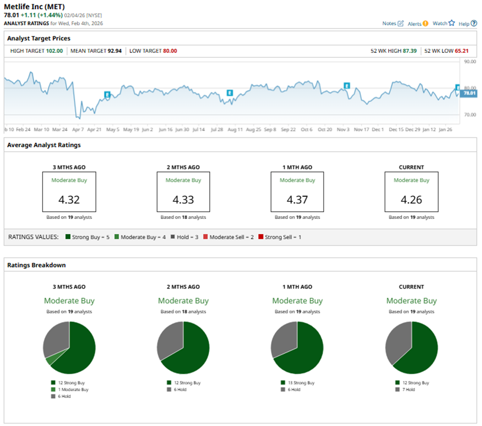 The mean price target of $92.94 represents a premium of 19.1% to MET's current levels. The Street-high price target of $102 implies a potential upside of 30.8% from the current price levels.
