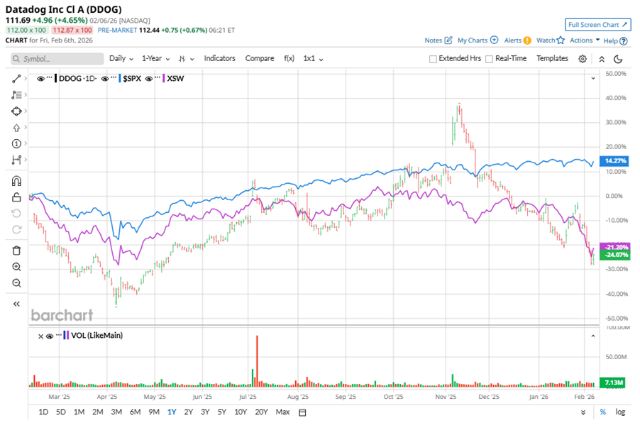 Shares of this cloud monitoring giant have underperformed the broader market considerably over the past year. DDOG has declined 22.9% over this time frame, while the broader S&P 500 Index ($SPX) has rallied nearly 14%. In 2026, DDOG stock is down 17.9%, while the SPX is up 1.3% on a YTD basis.