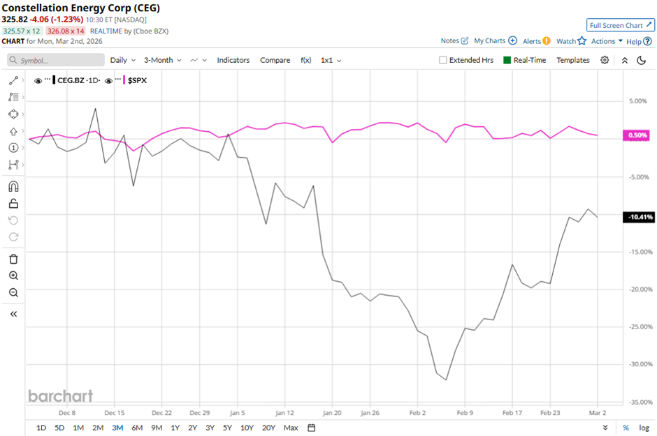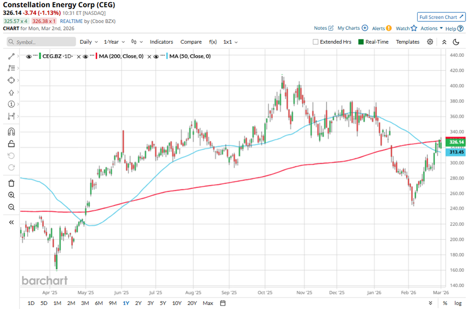 Shares of Constellation Energy climbed 6.4% on Feb. 24 after the company reported solid Q4 2025 results, including adjusted operating earnings of $2.30 per share and $9.39 per share for the full year, with full-year results exceeding the midpoint of guidance for the fourth consecutive year. Investor sentiment was further boosted by the completed acquisition of Calpine Corporation, creating the nation’s largest electricity producer, along with major growth drivers such as a $1 billion DOE loan guarantee for the Crane Clean Energy Center restart and long-term power agreements tied to data center demand.