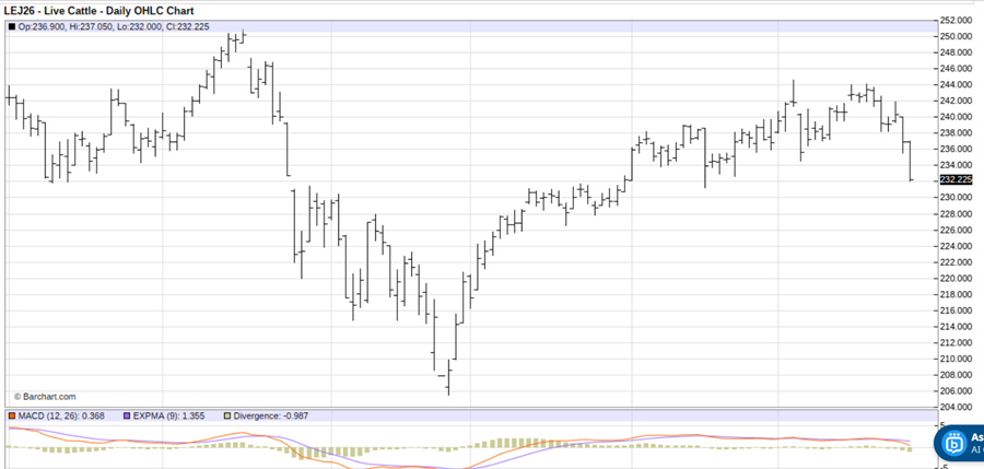 April live cattle (LEJ26) futures present a selling opportunity on more price weakness.